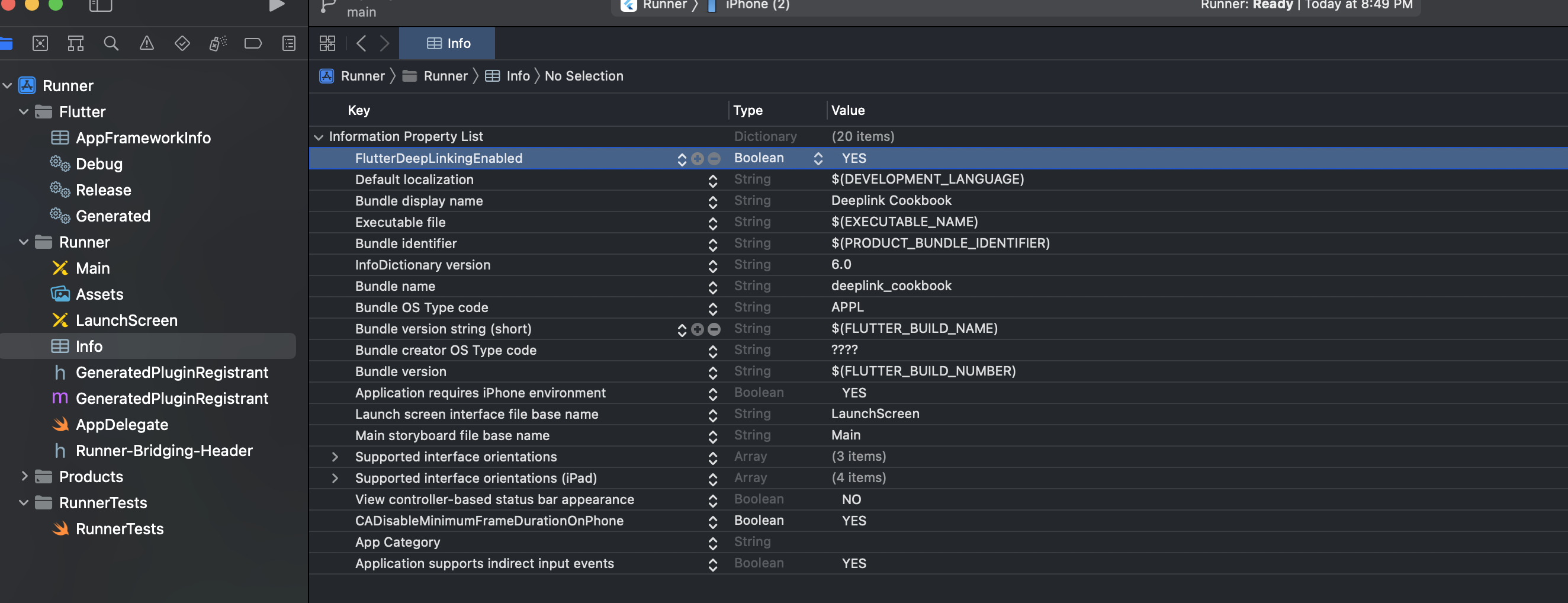 - Info에서 row를 추가하여 아래처럼 key, value 넣기 ( FlutterDeepLinkingEnabled : true )