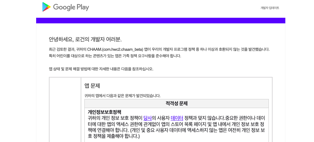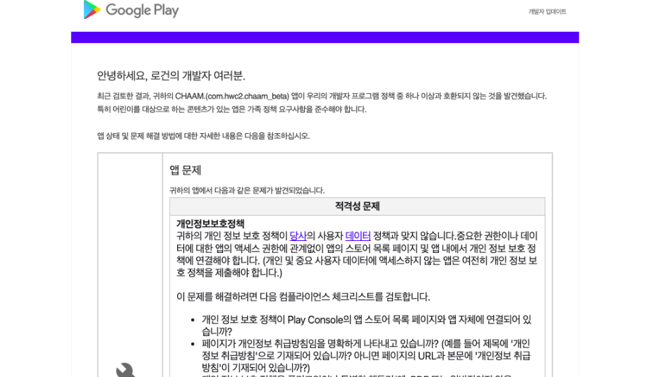 3. 개발자 프로그램 정책 중 하나 이상과 호환되지 않는 것을 발견했습니다..